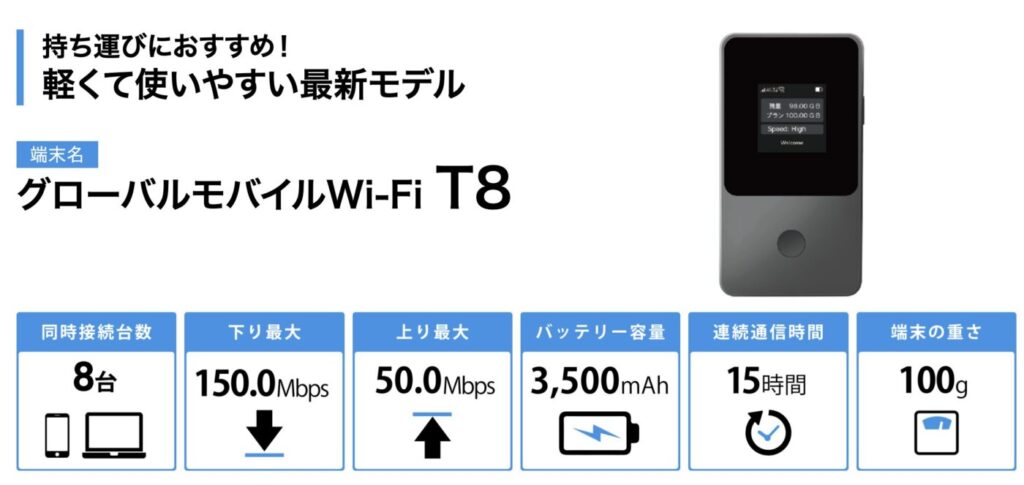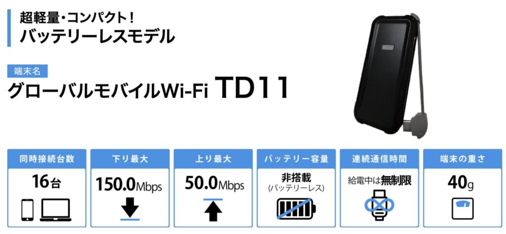 また無料レンタルができる端末はクラウドSIMに対応した、バッテリー内蔵型の「T8」とバッテリーレスモデルの「TD11」を採用しています。