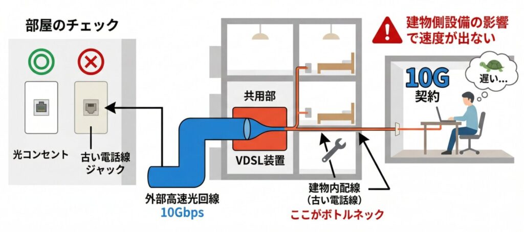 光コンセントではなく、古い電話線用の差し込み口(モジュラージャック)が部屋に設置されている場合、建物内の共用部設備がVDSL方式になっている可能性があります。この方式では、建物側の設備がボトルネックになるため、10ギガ回線に申し込んでも性能を発揮できないケースがあります。
