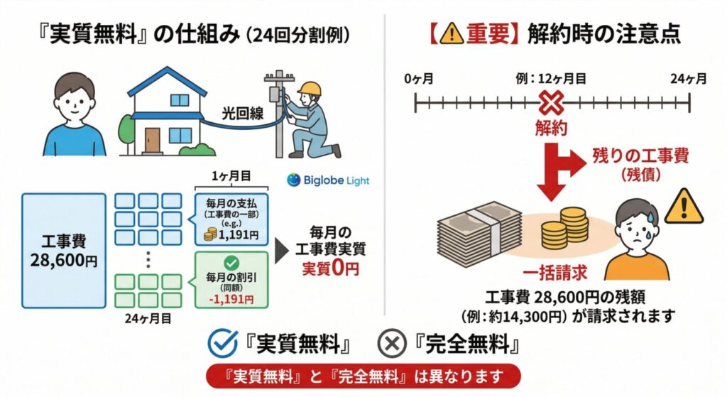 注意が必要なのは、この分割払い期間中に解約すると残りの工事費が一括請求される点です。「実質無料」と「完全無料」は異なります。