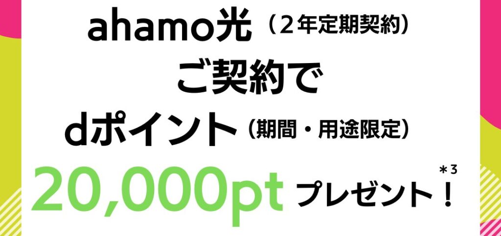ahamo光へ新規申し込み、もしくは転用・事業者変更でドコモのdポイント「20,000pt」をプレゼントするキャンペーンを実施しています。