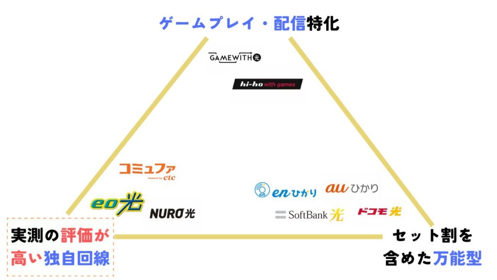 一方、「NURO光」や「eo光」、「コミュファ光」などの「独自回線」**は利用者が限定されるため、混雑しにくく安定したPing値を保ちやすいのが特徴です。