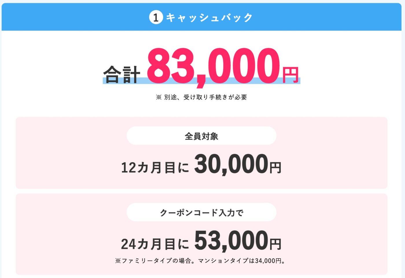 限定クーポンコード入力による増額キャッシュバック | マンション:34,000円 戸建て:53,000円 (受取期間24ヶ月目) | 86,000円 (受取期間24ヶ月目) |