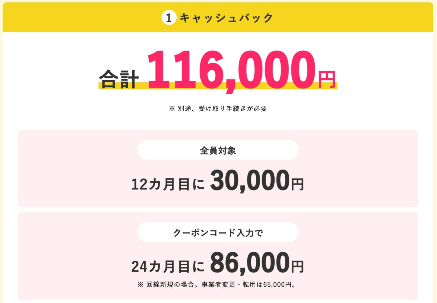 期間限定で特典増額クーポン含め最大116,000円のキャッシュバック増額(10ギガプランの場合)を実施中