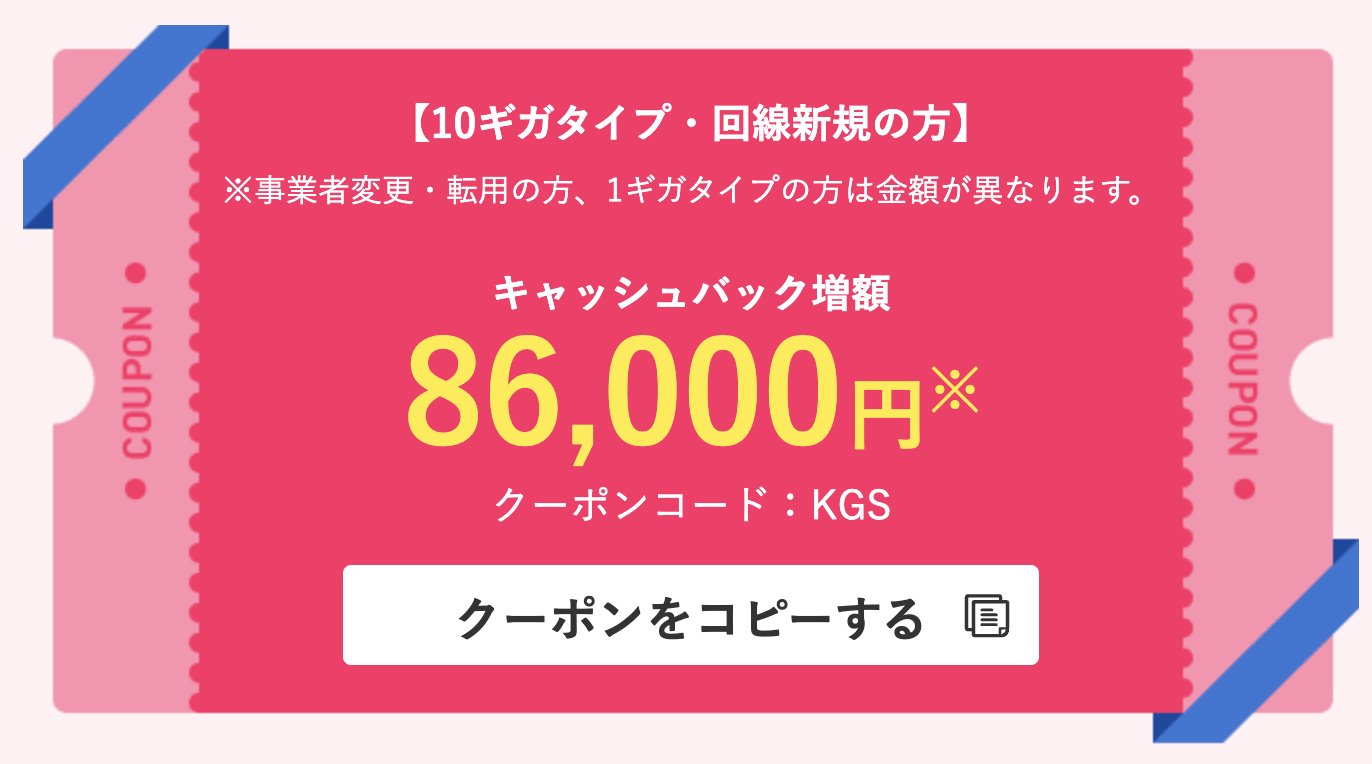 オプション加入条件なども必要なく申し込みだけでもらえるキャッシュバックは1ギガ、10タイプともに30,000円、そしてクーポン特典で10ギガは最大86,000円、1ギガは最大53,000円の追加キャッシュバックが適用されます。