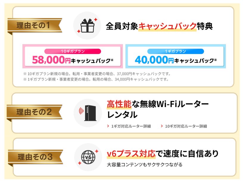 | 事業者変更 | 既に利用しているフレッツ光コラボからの乗り換え | 他の光コラボ(SoftBank光、so-net光、ぷらら光、ビッグローブ光、nifty光、GMOとくとくBB光)を現在使っているユーザー |