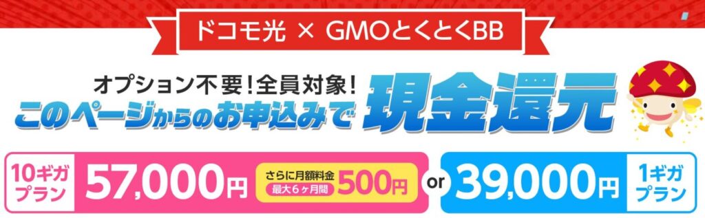 端末残債が残っていても、GMOとくとくBB経由でドコモ光に申し込むと1ギガタイプで39,000円、10ギガタイプで57,000円のキャッシュバックが受け取れます。端末残債が1〜3万円程度であれば、キャッシュバックで十分カバーできます。