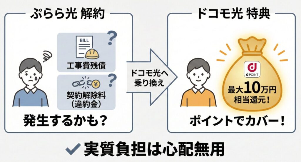 なお、乗り換えにかかる工事費残債や契約解除料は、ドコモ光の乗り換え特典として最大10万円相当がポイントで還元されるため、費用面での不安は比較的少ないといえます。