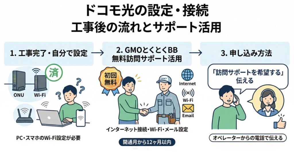 工事完了後はパソコンやスマホをWi-Fiに接続する設定が必要です。設定に不安がある場合はGMOとくとくBBの無料訪問サポートを活用できます。