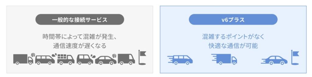 GMOとくとくBBはv6プラス(IPv6)に対応しており、夜間の混雑時間帯でも速度が安定しやすいのが特徴です。通常のPPPoE接続では夜間に速度低下が起きやすいですが、v6プラスはその問題を大幅に軽減できます。