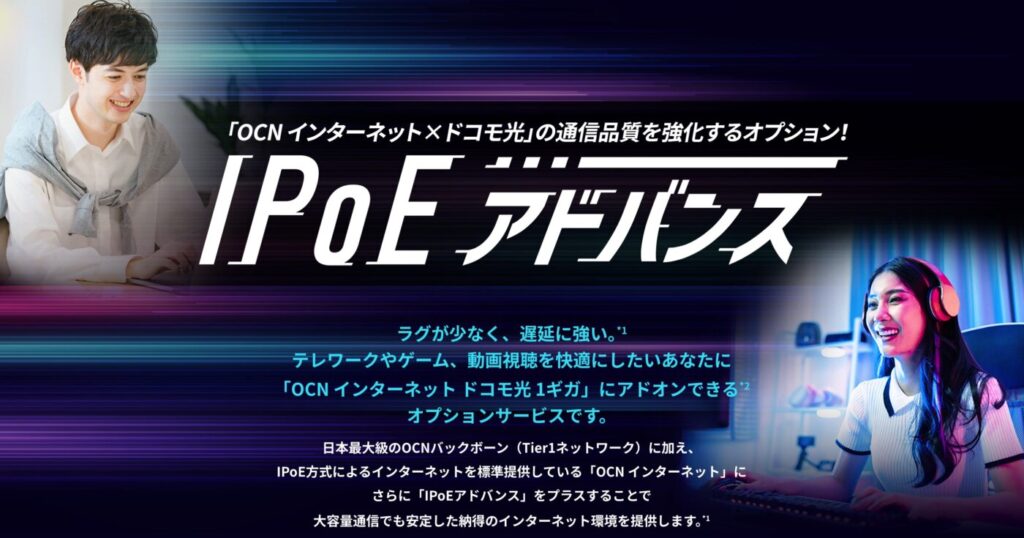 もしドコモ光の10ギガタイプが導入できない地域や建物であっても、OCN インターネットが提供する「IPoEアドバンス」オプションを利用すれば、1ギガ回線でも快適な通信環境を実現できる可能性があります。