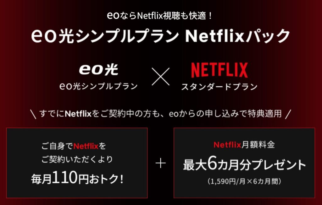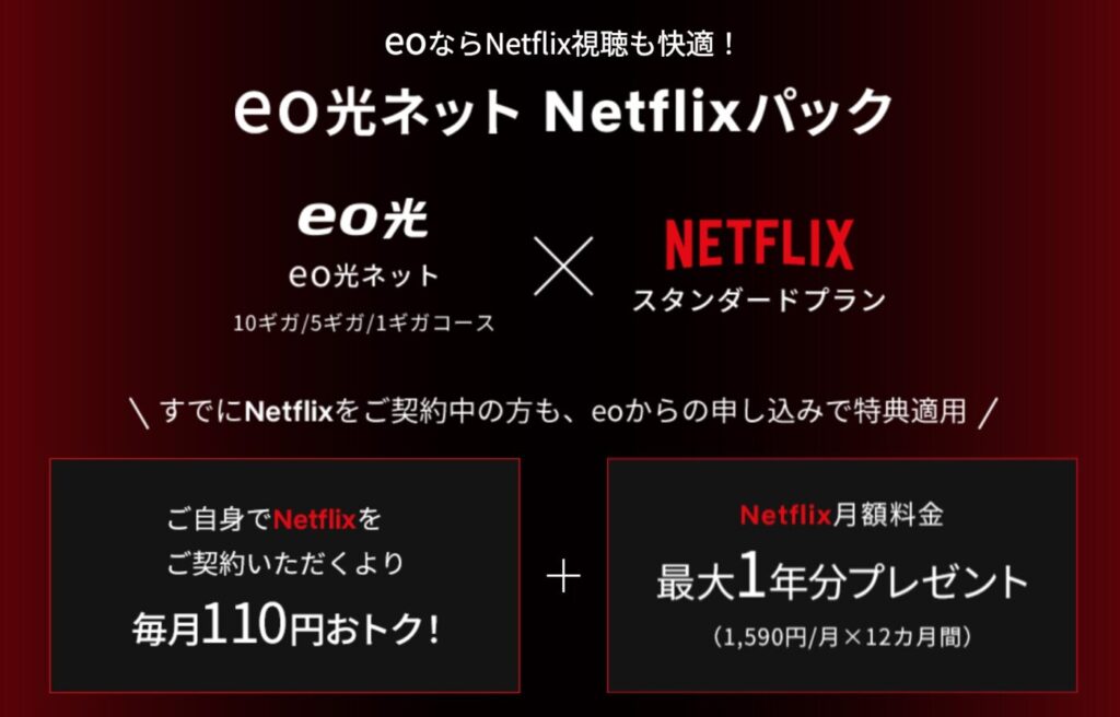 | eo光NetflixパックスタートキャンペーンA | eo光ネット 10ギガコース Netflixパック、eo光ネット 5ギガコース Netflixパック、eo光ネット 1ギガコース Netflixパックの月額料金を最大12カ月間1,590円割引 |