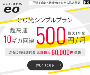 | eo光 シンプルプラン (10ギガ) | (500円×12ヶ月) + (5,500円×12ヶ月) + 事務手数料3,300円 | 75,300円 |