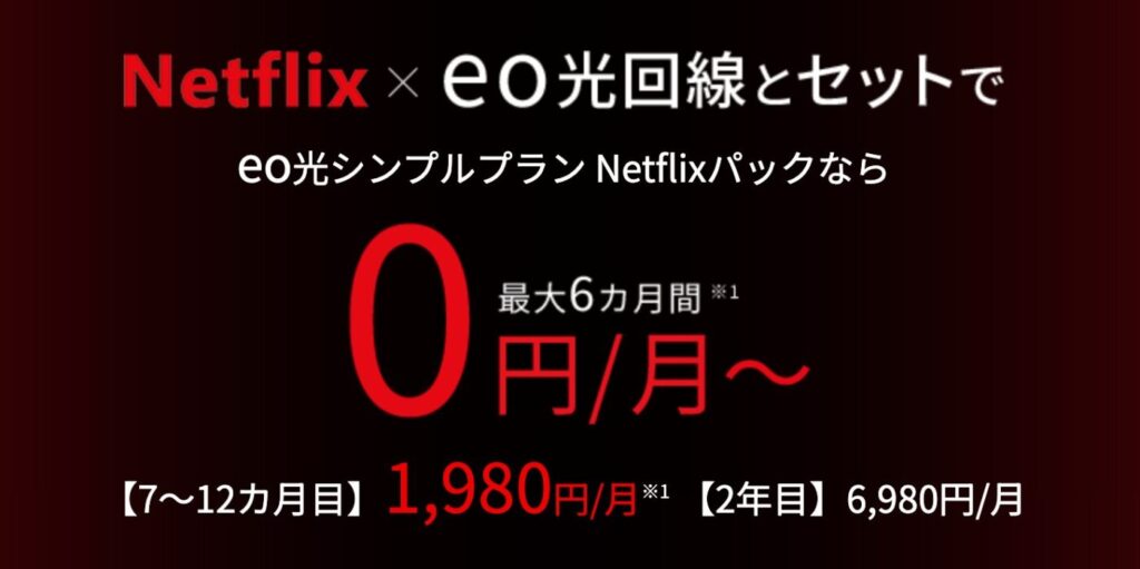 eo光×Netflixパックは、新規・乗り換え契約者の場合には最大1年間無料でNetflixが見れるパックですが、1年経過後や、既に現在eo光を契約している人にとってもメリットがあるプランになっています。