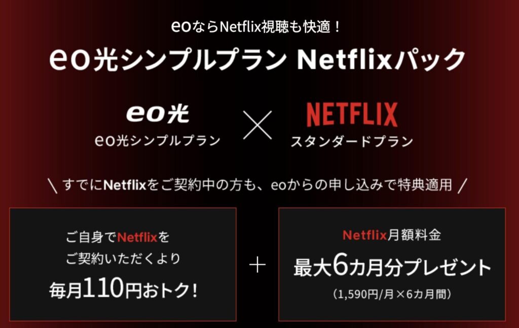 eo光シンプルプランは10ギガの高速通信が使え、ネットだけの契約で非常にシンプルにお得に使えるプラン。こちらにNetflixが最大6ヶ月プレゼント(1,590円×6ヶ月)となるパックプランです。
