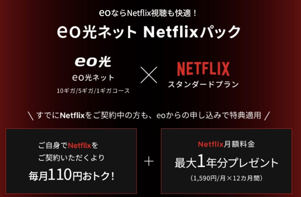 eo光NetflixパックスタートキャンペーンA | eo光ネット 10ギガコース Netflixパック、eo光ネット 5ギガコース Netflixパック、eo光ネット 1ギガコース Netflixパックの月額料金を最大12カ月間1,590円割引 |
