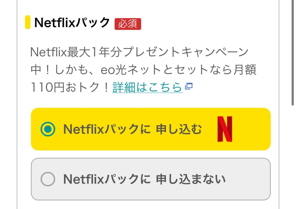 eo光申込時に「Netflixパックに申し込む」にチェックを入れることで特典の対象となります。