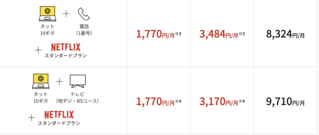 通常の月額だけ見ると高めに感じますが、光回線の使い放題とNetflixがセットになってこの料金なので、年間で考えるとむしろかなりお得なパックです。