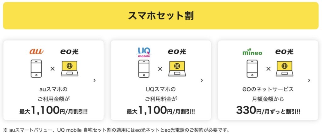 eo光では1年間の月額割引とNetflix 6ヶ月〜最大1年分無料の他に、au/UQ mobile/マイネオのスマホユーザーは更にセット割が適用され、eo光利用中は毎月永年割引が適用されます。