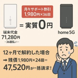 もし1年(12回払い)で解約すると、残り24〜36回分の端末代金(約47,000円など)が、違約金とは別に一括請求されます。