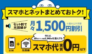 大手キャリアでは毎月最大1,000円ほどの割引が受けられますが、格安SIMの場合、光回線とのセット割でも割引額は数百円程度にとどまります。それでも、少額でも割引が受けられるのであれば、同じグループ会社の光回線を選んでおくに越したことはありません。