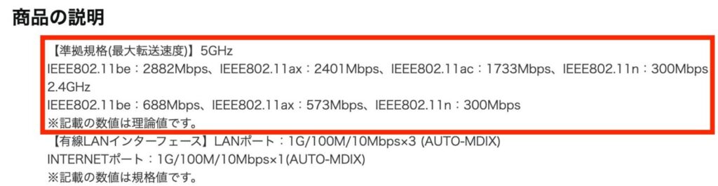 Amazonでは無線LANルーター商品ページで下へスクロールすると「商品の説明」という項目をがあり、そこにIEEE802.11a/b/g/n/ac/ax/be表記がしっかりあるか確認するようにしましょう。