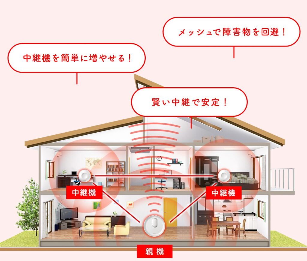 戸建てやマンションでも部屋数が多く広い場合、各部屋のすみずみまで安定したWi-Fi電波を届ける必要があります。しかし、ルーター1台ではカバーしきれないことも多く、その弱点を補うのが「メッシュWi-Fi」機能です。
