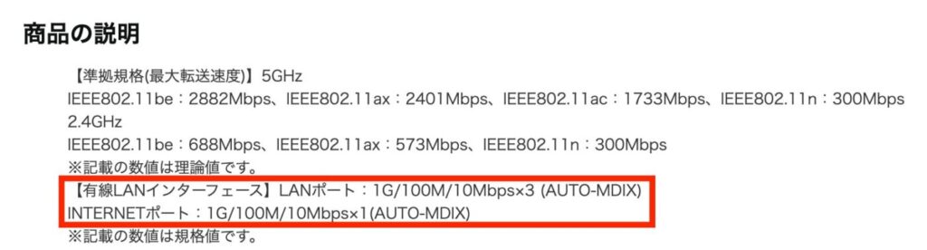 この場合、対応しているのは最大1Gbpsまでなので、たとえインターネット回線や接続機器(パソコン・ゲーム機など)が10Gbps対応でも、実際の通信速度は1Gbpsが上限となります。