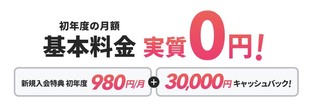 通常5,500円〜6,050円かかる月額料金が、最初の1年間に限り月額980円で利用できる割引キャンペーンです(※マンションタイプは対象外)。