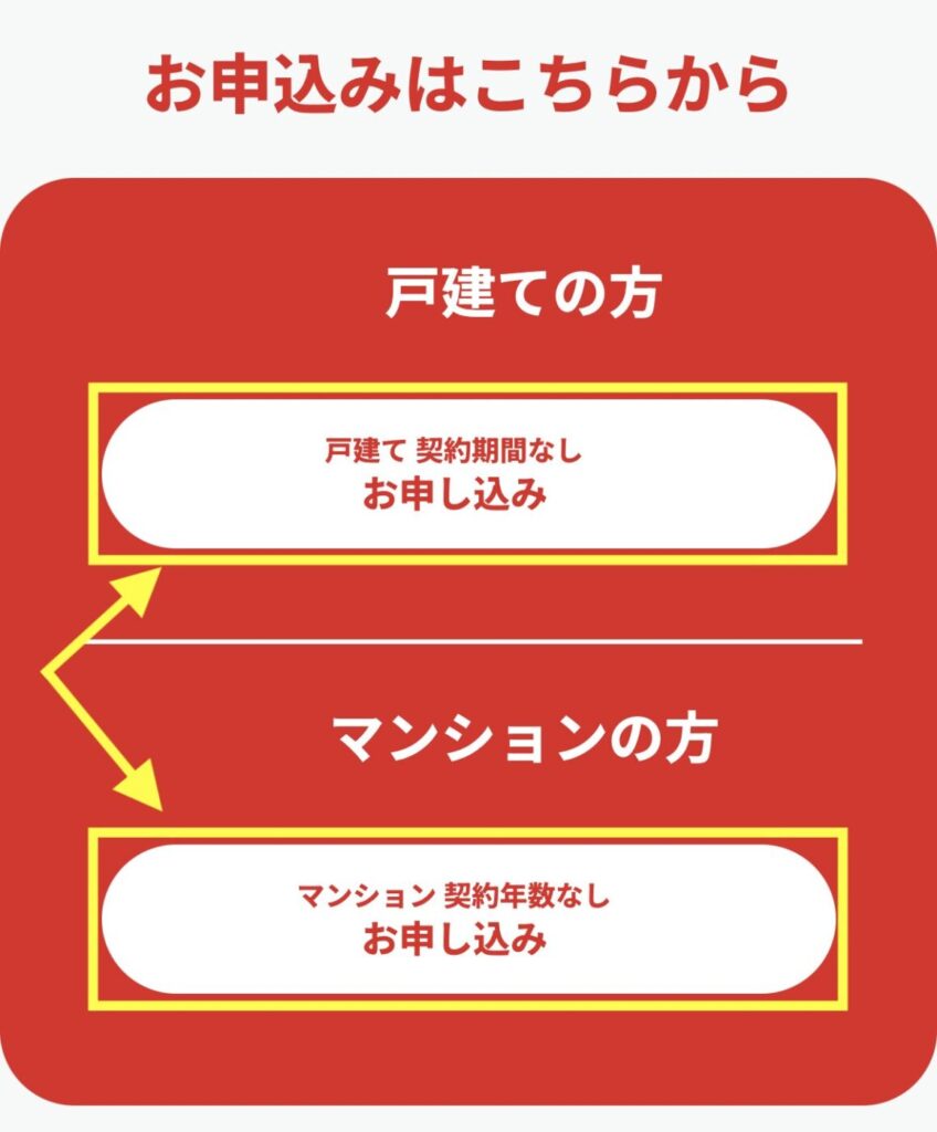 NURO光のWEB限定特別ページ(公式)へアクセス後、下へスクロールして【戸建ての方】【マンションの方】それぞれ該当する方のお申し込みボタンを押す。