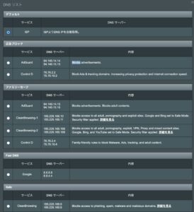 高性能なルーターやゲーミングルーターの場合、予め高速DNSの一覧などが用意されており、数値を入力せずとも選ぶだけで設定変更できるメーカーもあります。