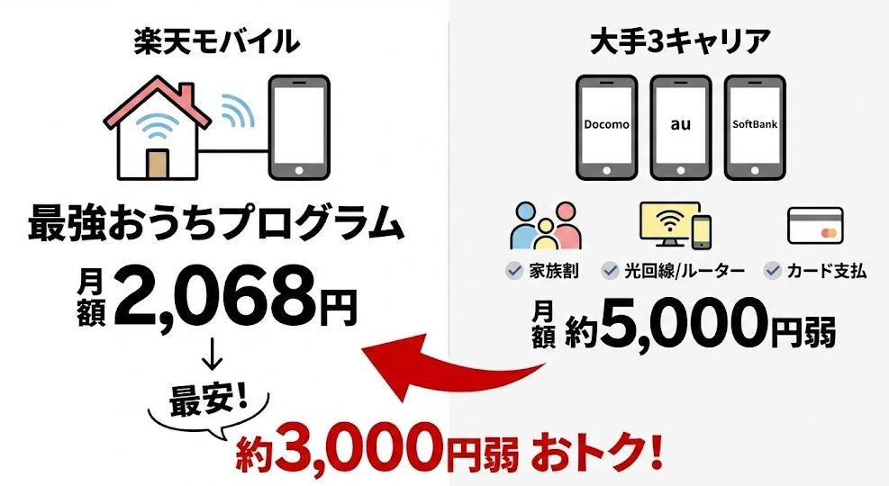 それに対して楽天モバイルは「最強おうちプログラム」を適用することで、他社の無制限データプランよりも約3,000円弱も安い【2,068円】で利用できる計算です。
