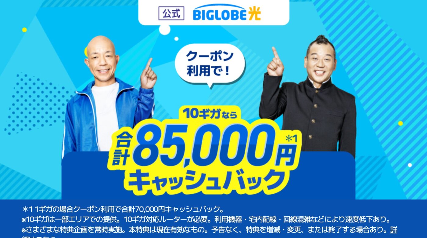 期間限定増額クーポンで最大85,000円のキャッシュバック増額(10ギガプランの場合)を実施中