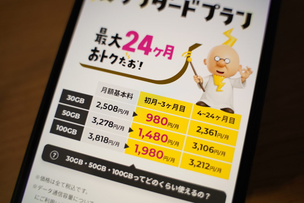 ただし24ヶ月契約の「スタンダードプラン」なら最初の3ヶ月間は月980円と非常に安く、4ヶ月目以降も2,361円で使い続けられます。20GBより10GB多い容量がこの価格で使えるのは、コスパとして見逃せないポイントです。