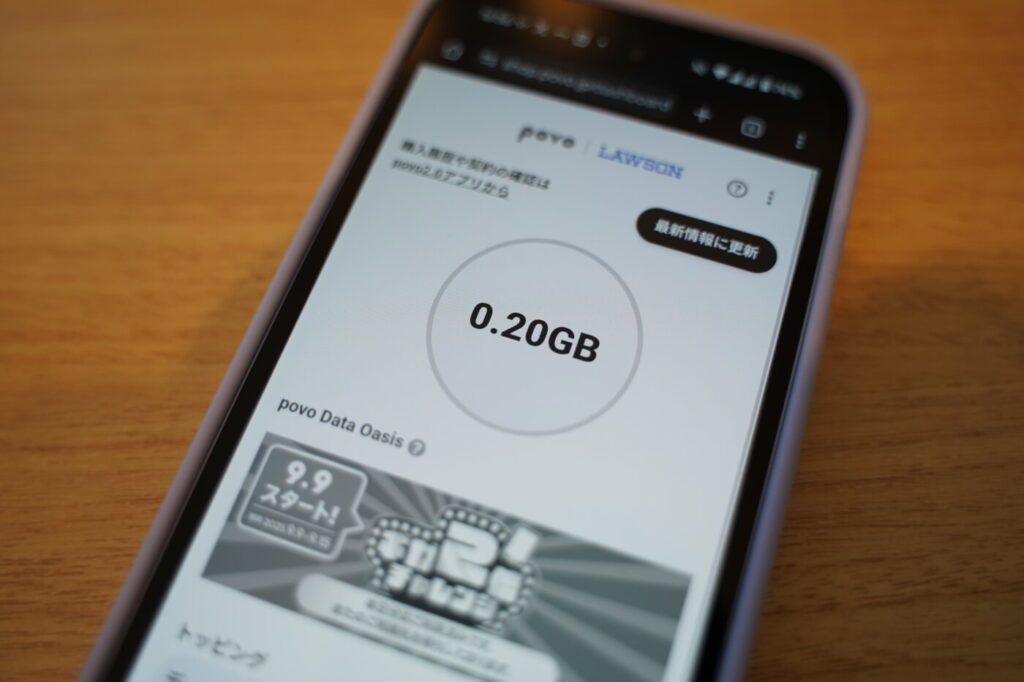 povo 2.0には「povo Data Oasis」というサービスがあり、ローソン店舗に来店するだけで1日100MBのデータ容量が獲得できます。月に10回来店すれば最大1GBが無料で手に入る計算です。