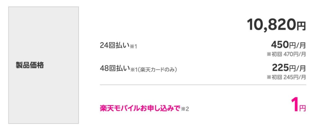 現在、楽天モバイルのプランと同時申し込みで「Rakuten WiFi Pocket Platinum」が通常10,820円→1円で購入できるキャンペーンを実施中です(終了日未定)。事務手数料も無料なので、初期費用は実質1円のみです。