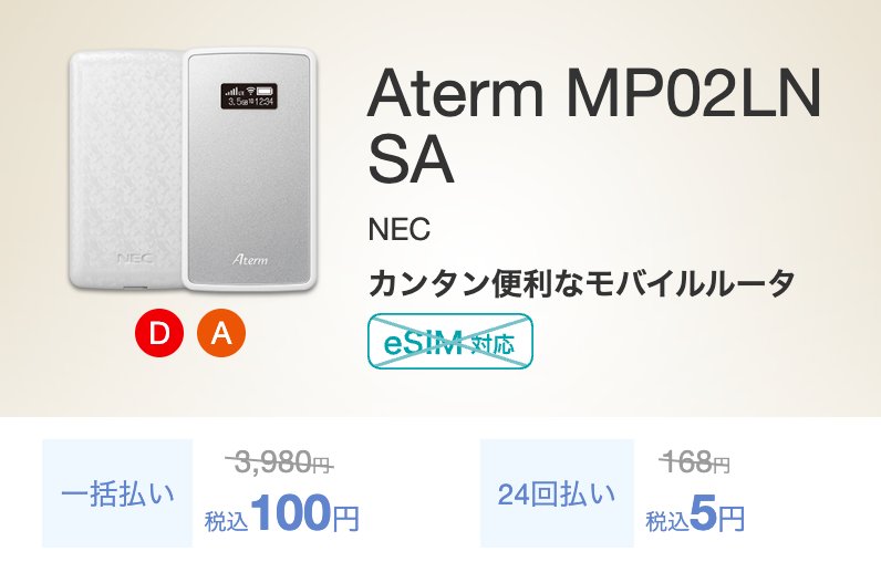 2026年6月8日まで、回線とのセット申し込みでNECのモバイルルーター「Aterm MP02LN SA」が通常3,980円→100円で購入できるキャンペーンを実施中です。