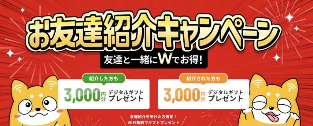 また現在はAiR-WiFiを友達に紹介することで、1名紹介につき紹介した方・された方両方に3,000円分のデジタルギフトをプレゼントを実施中。