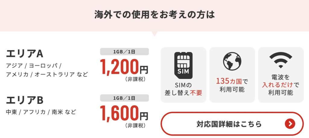 エリアはアジア・ヨーロッパ・アメリカ・オーストラリアエリアが1GB/1日で1,200円〜、中東・アフリカ・南米エリアが1GB/1日で1,600円〜の費用で利用が可能です。※1GB超過後は翌日まで128Kbpsの速度制限になります。