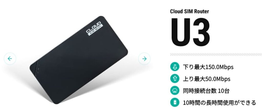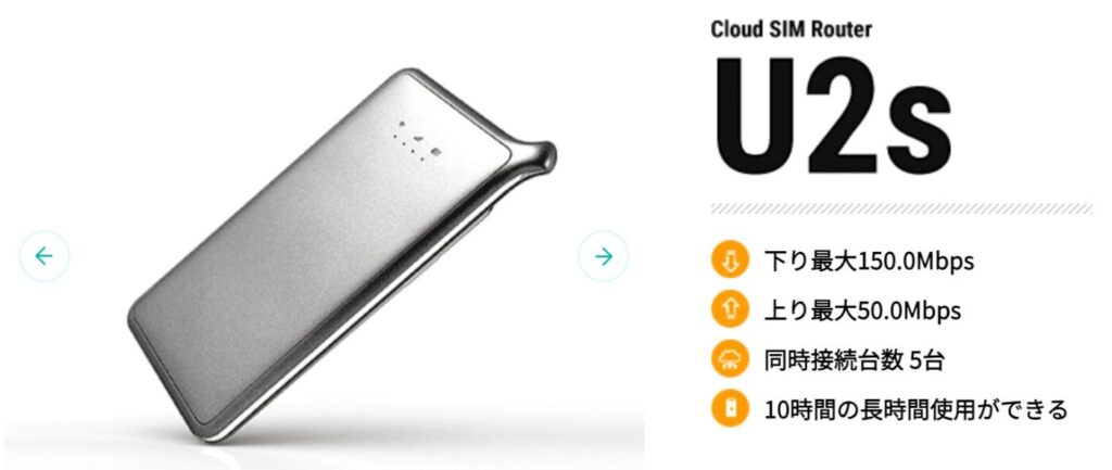 無料レンタルとして提供されるクラウドWiFiの通信端末は「U2s」もしくは「U3」というクラウドSIMに対応した下り最大150Mbpsのコンパクトサイズの端末です。