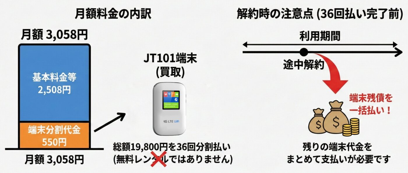 どこよりもWiFiで提供されるJT101端末は無料レンタルではなく、19,800円での買取となります。これを550円×36回の分割払いで支払う形となるため、月額料金3,058円にはこの端末代金550円が含まれています。