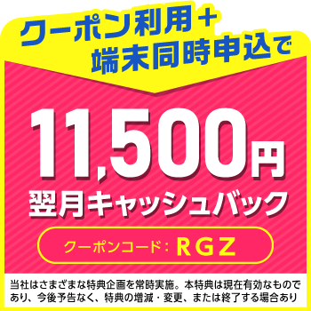 BIGLOBE WiMAXを申し込みする際にクーポン配布専用ページへアクセスしクーポンコード「RGZ」を入力することで11,500円のキャッシュバックが開始翌月に受け取れます。