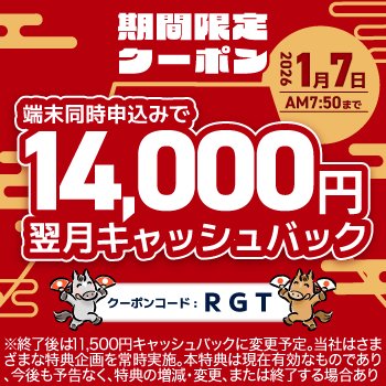 クーポンコードで翌月に14,000円キャッシュバック(1/7まで増額)