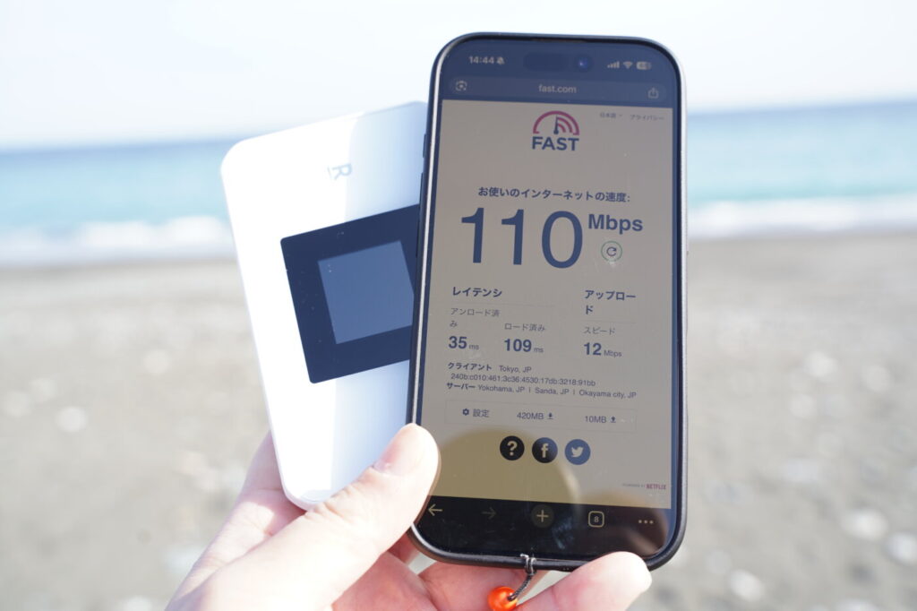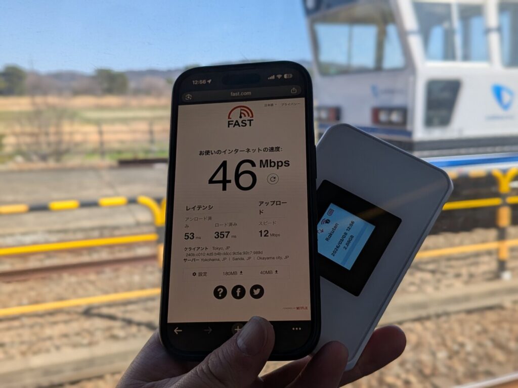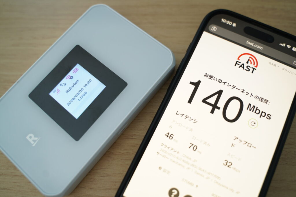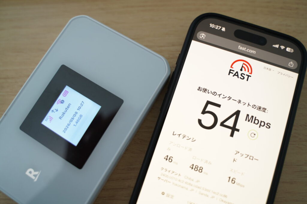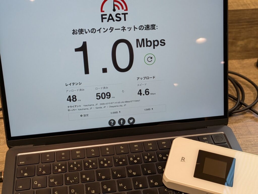 Rakuten WiFi Pocket 5Gの実際の通信速度をfast.comで計測しました。測定時の条件は以下の通りです。