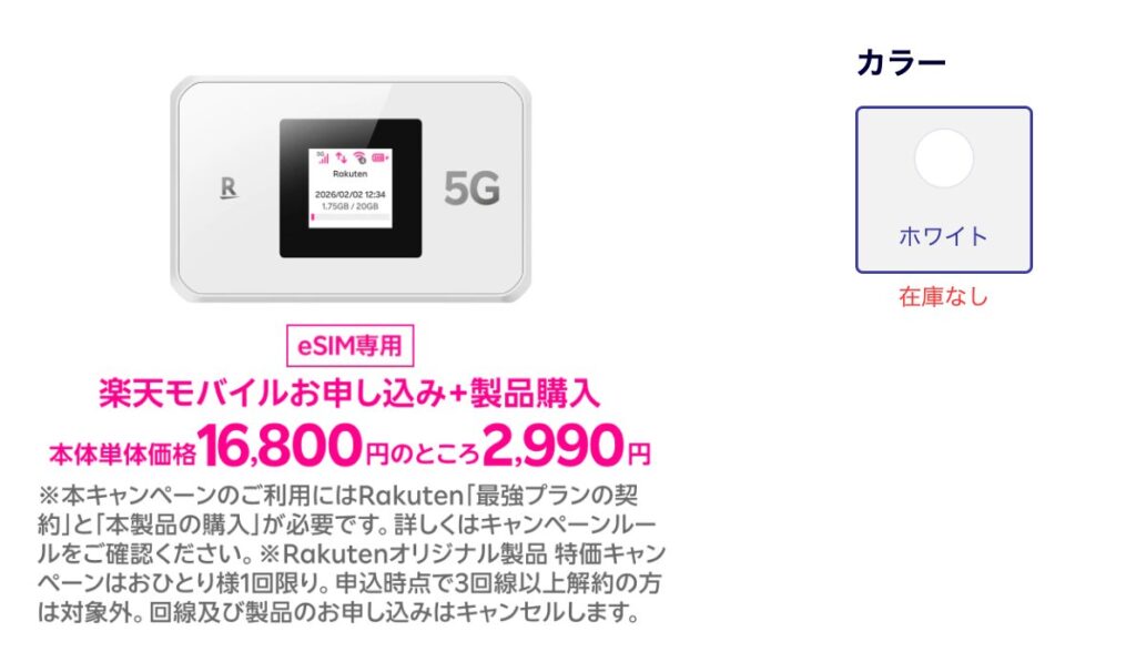 生産数が間に合わなかったのか3/8時点では在庫が無くなっています。在庫復活まで待つか、速度にこだわりが無い方は旧型の1円ルーター(Rakuten WiFi Pocket Platinum)を検討しても良いでしょう。