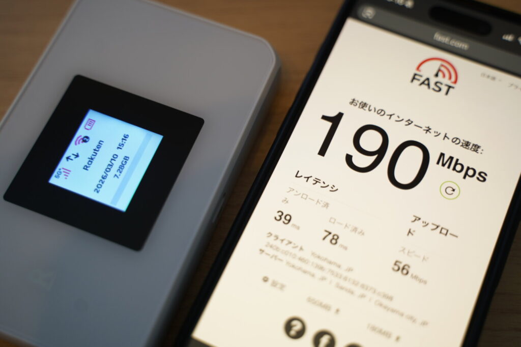 旧型のRakuten WiFi Pocket Platinumも決して遅くありませんが、Rakuten WiFi Pocket 5Gの190Mbpsと比べると約18倍以上の差があります。