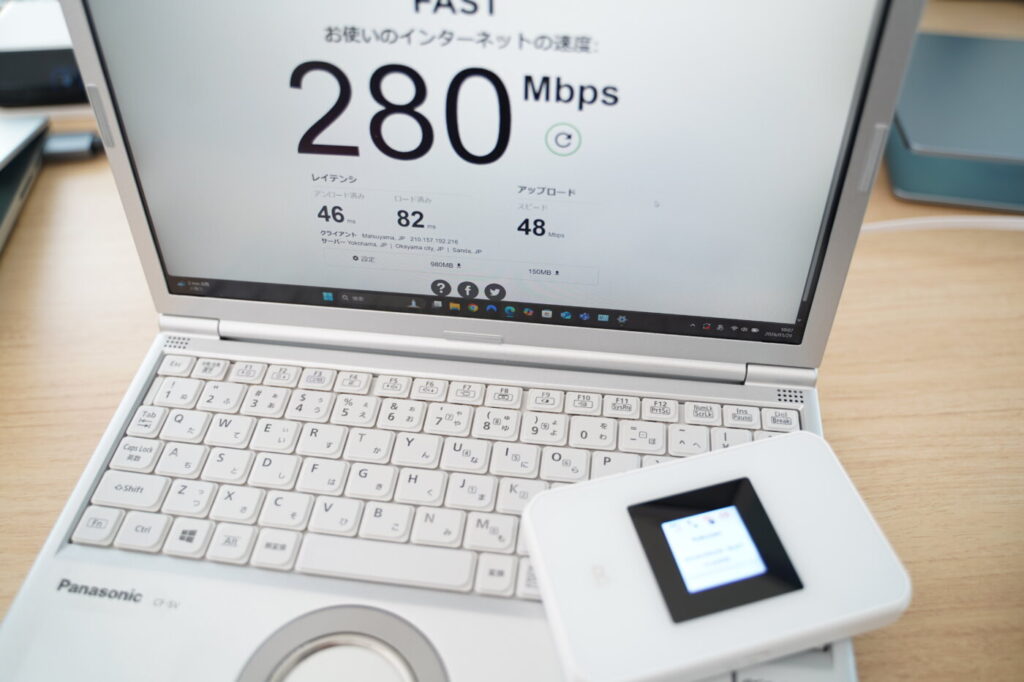 自宅が5Gエリア内のため、5GHz接続時の下り速度は常時100Mbps超えを記録しました。WiMAXとの比較検証では280Mbpsのさらに高速な通信を実現しています。