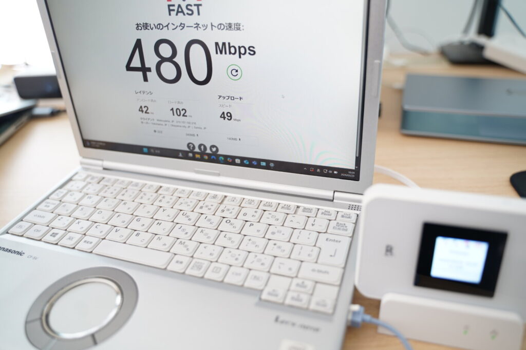 Windowsパソコン(レッツノートSV9、Wi-Fi 6対応)との接続を行ってみると、クレードル経由で有線LAN接続を行った場合だとWi-Fi接続時と比べて200Mbpsも下り速度が向上しています。