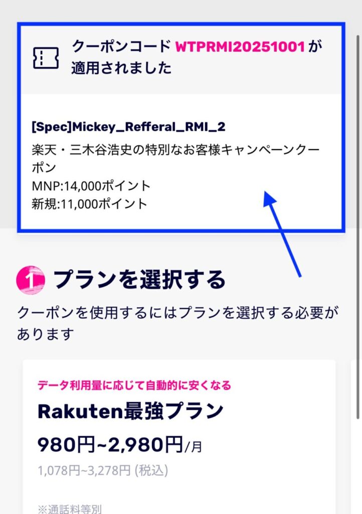 あとはプランを申し込む(データタイプは特典対象外)を押し、以下の画面に従って楽天モバイルの申し込みを進めれば特典が対象となります。