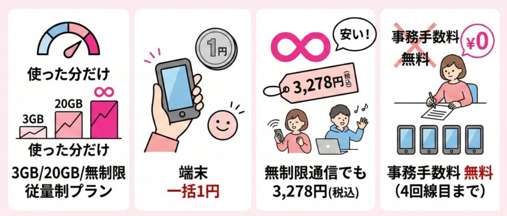 ドコモ、au、ソフトバンクの3キャリアの通信エリアに対応し、日本国内どこでも繋がる安心感もあり、最短3日からすぐに始められ、コスパ最強のモバイルプランです。