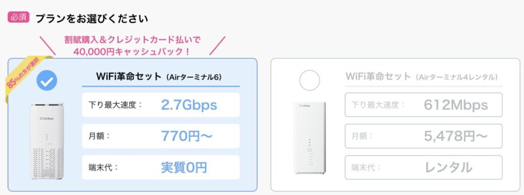 WiFi革命セットは月額料金の大幅だけでも十分すぎる特典内容ですが、クレジットカード払い&ホームルーター端末の割賦購入を選択することで40,000円のキャッシュバック特典が受けられます。